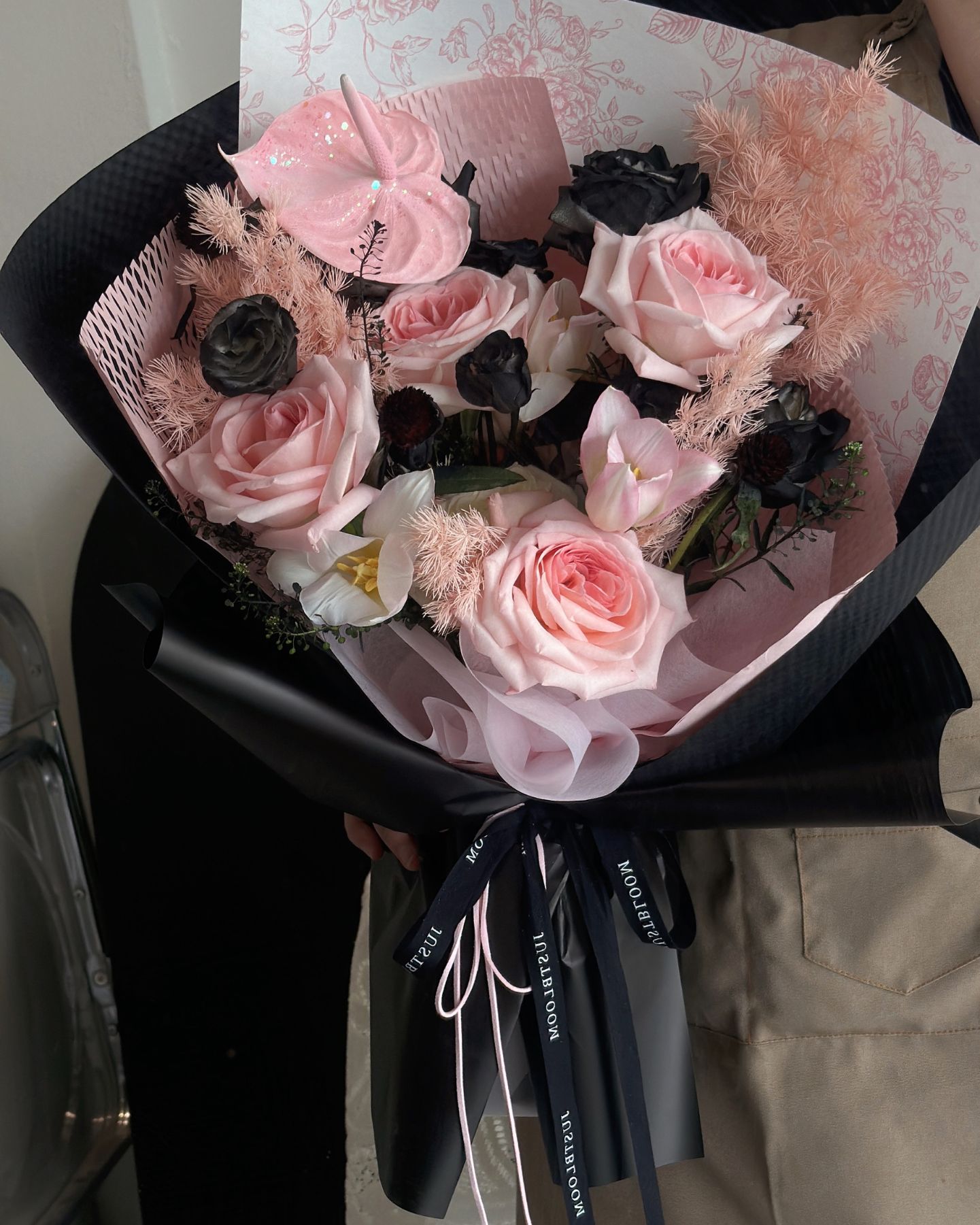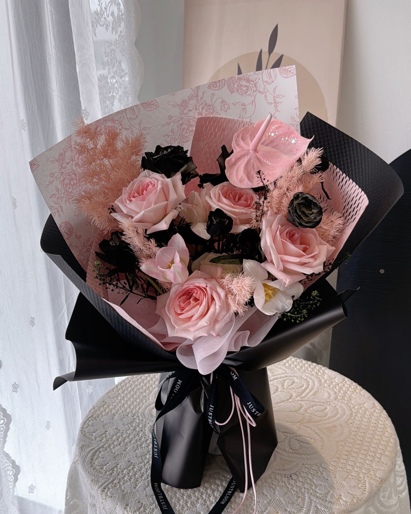 Pink Roses, Eustoma,Anthurium,Tulips with filler flowers ( Black colour flowers is using flowers colour spray )