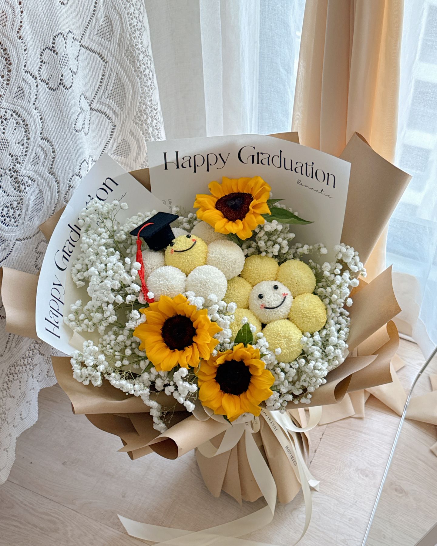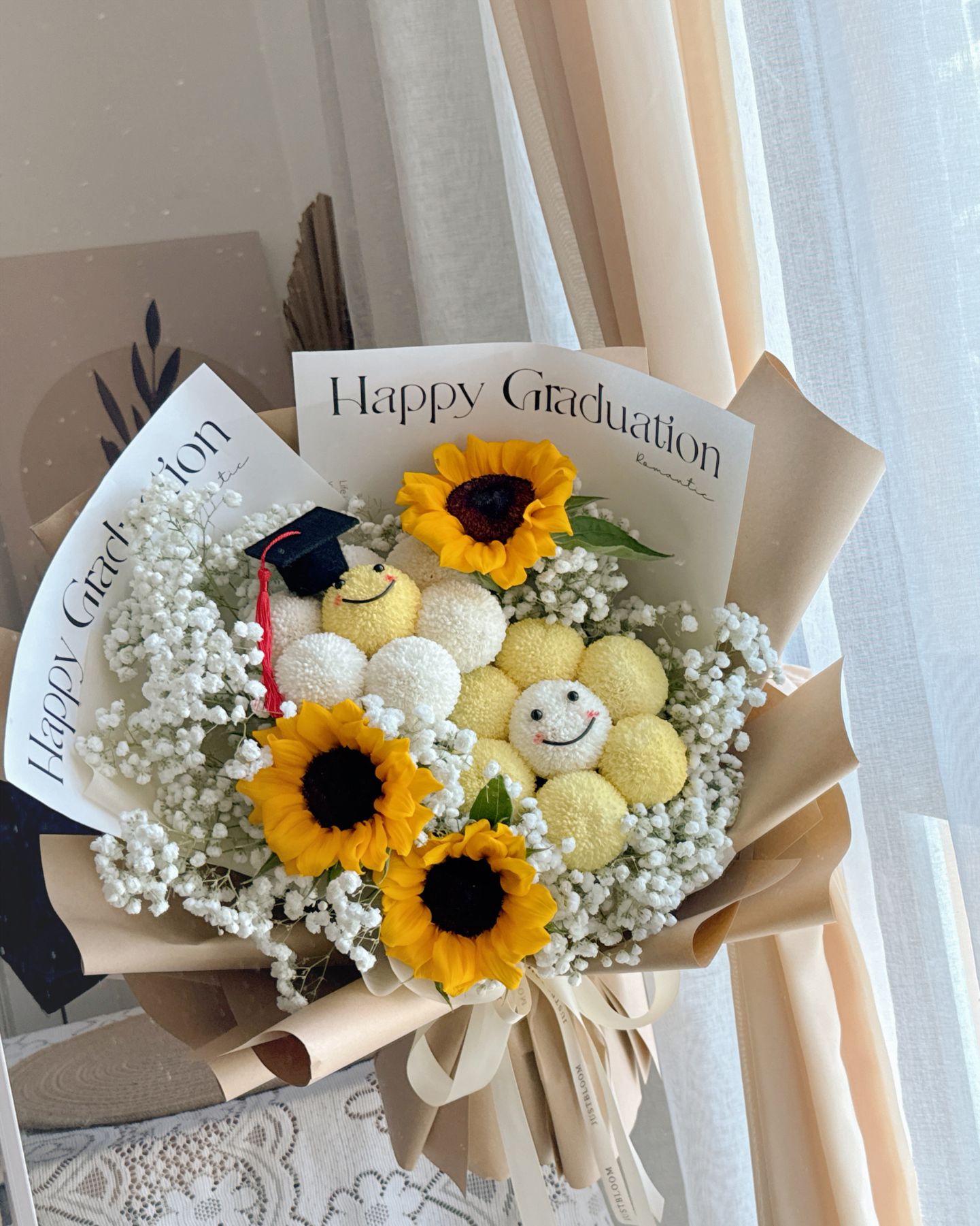 Smile Ping Pong+Graduation Hat, Sunflower and baby breath.
