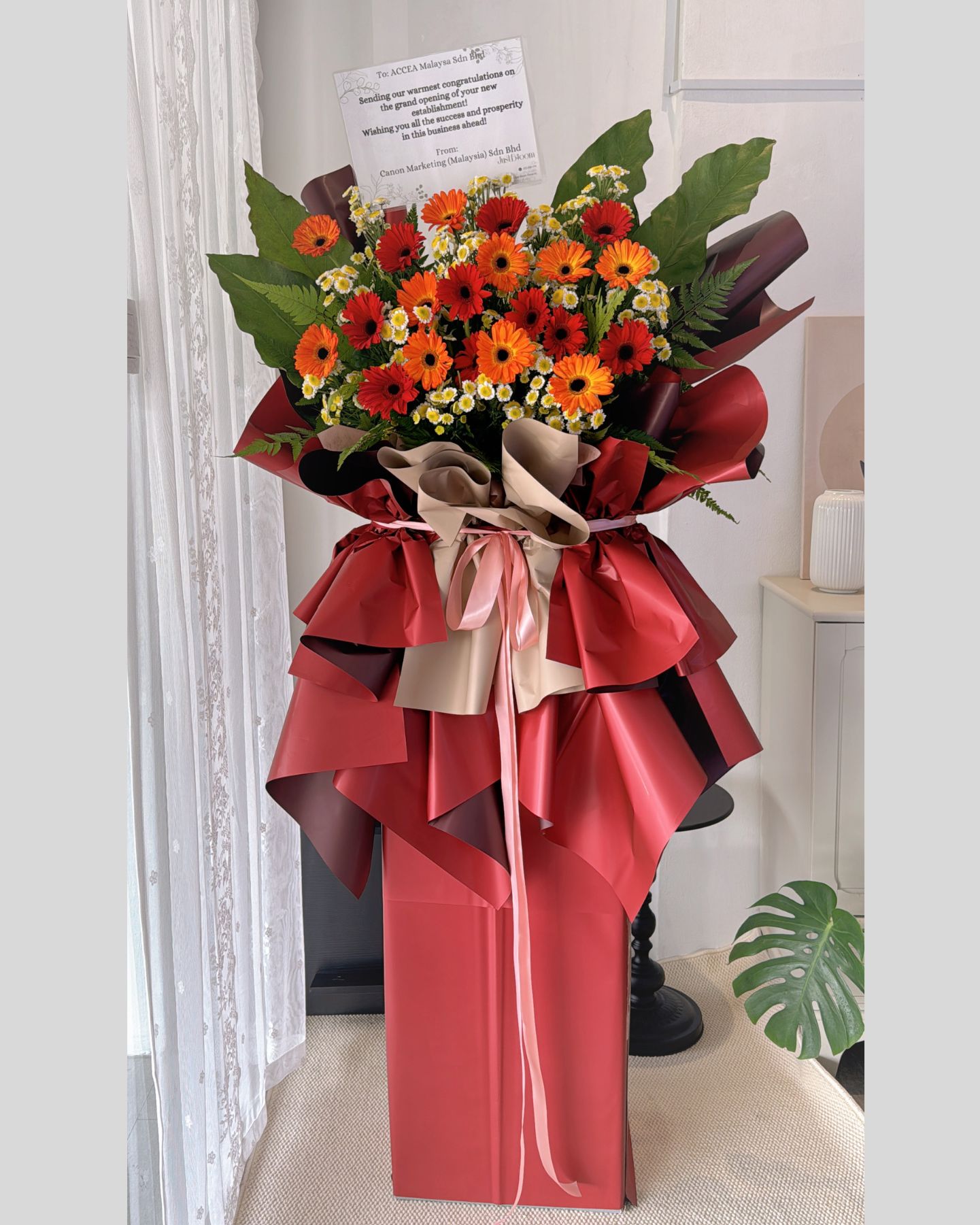 Gerbara, Sunshine Pom Pom and BOP leaf Box Flower Stand High 190cm