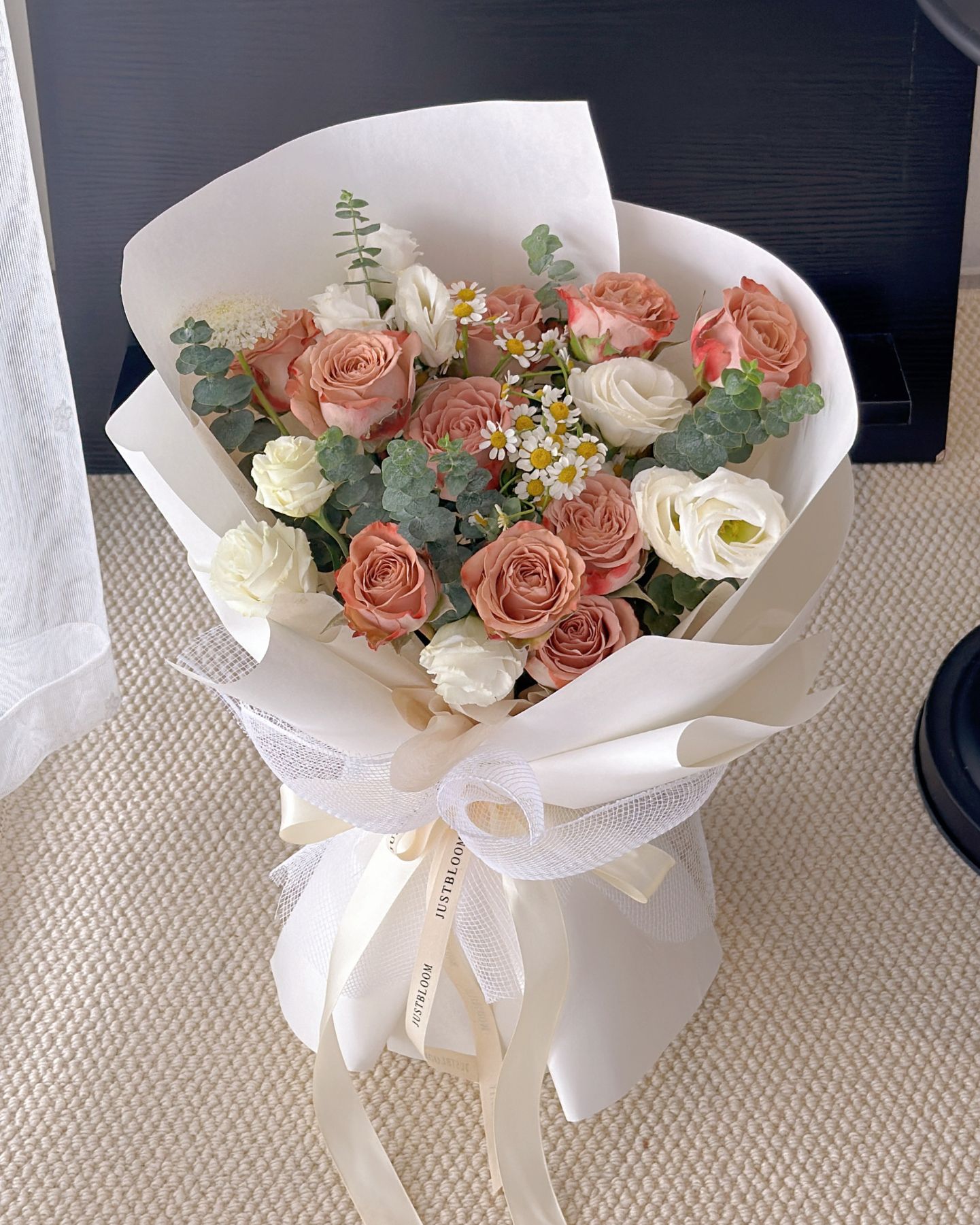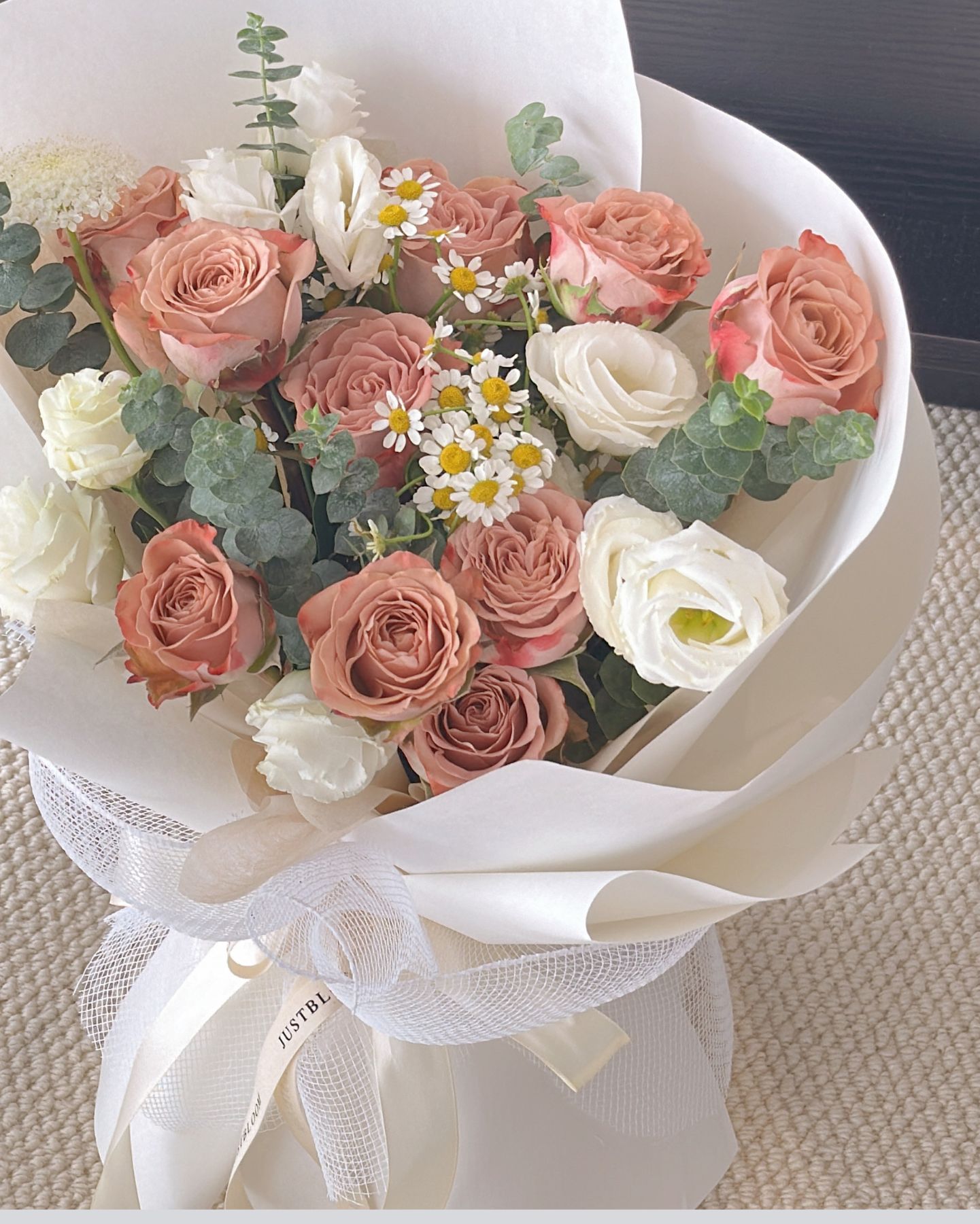 Feature flower: Cappuccino Rose, Eustoma, chamomile and eucalyptus Come with a FREE Message Card ๐Ÿ’Œ